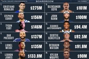 体育资讯10月6日讯 今天,美媒BoardRoom转载了世界范围内收入(工资+代言)最高的运动员排名,这份榜单最早发布于今年5月。